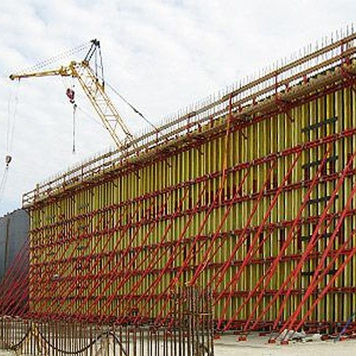 - Подкосы и упоры. Для выверки вертикали/жёсткости стен: подкосы для опалубки стен, телескопический упор 170–290 см и 260–400 см; решения для сложных высот — подкос одноуровневый 6 м, двухуровневый 4,5 м / 6 м.