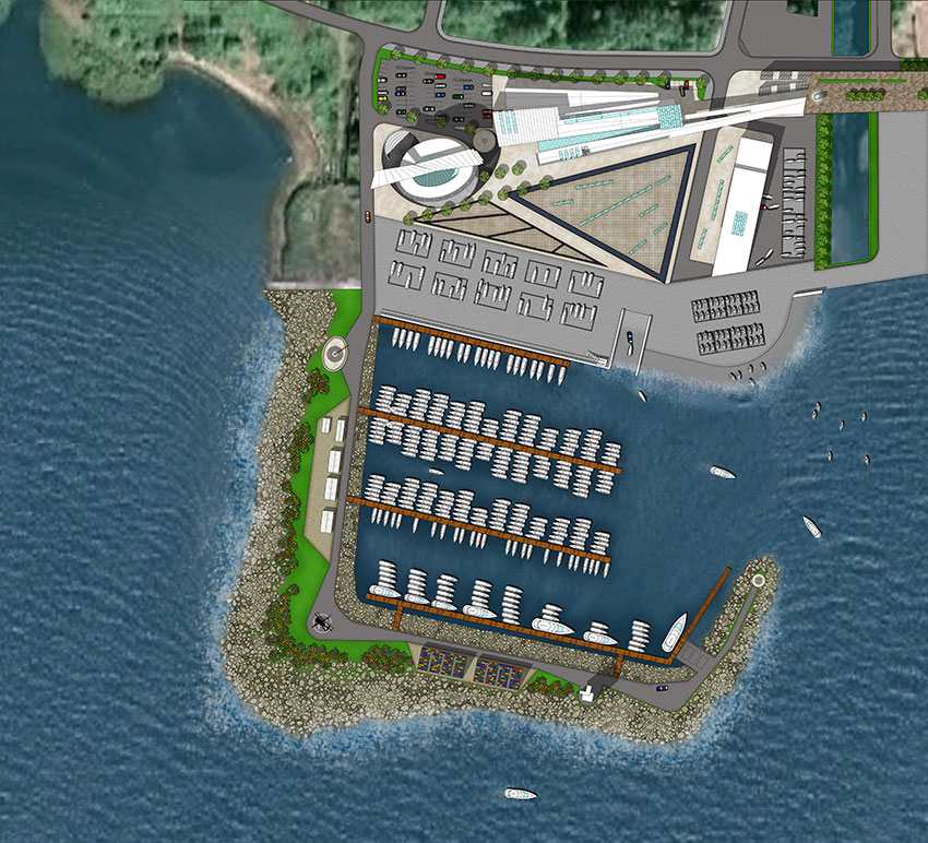 Площадь участка, расположенного за «Лахта Центром», - 4 га. Здесь планируется построить яхт-центр площадью 3,6 тыс. кв. м, бутик-отель и медиабашню. Для судов предусмотрены 50 мест для открытого хранения судов длиной от 15 до 20 метров, 50 мест – для судов длиной 10-15 метров, а также 100 мест для судов меньшей длины. Как ранее сообщали СМИ, в яхт-центре планируется разместить помещения для посетителей, зал для попечительского совета яхт-клуба в виде капитанского салона, а также кабинеты. Для гостей соревнований запланирован эксклюзивный бутик-отель на 65 номеров класса «люкс» и пять VIP-пентхаусов. На крыше разместится вертолетная площадка. Высота медиабашни составит 47 метров. В ней предусмотрены панорамные этажи для просмотра соревнований, а также кабины комментаторов. Стоимость проекта оценивается в 60 млн долларов. По данным СМИ, управлять центром будет совладелец порта «Геркулес» Владимир Любомиров.